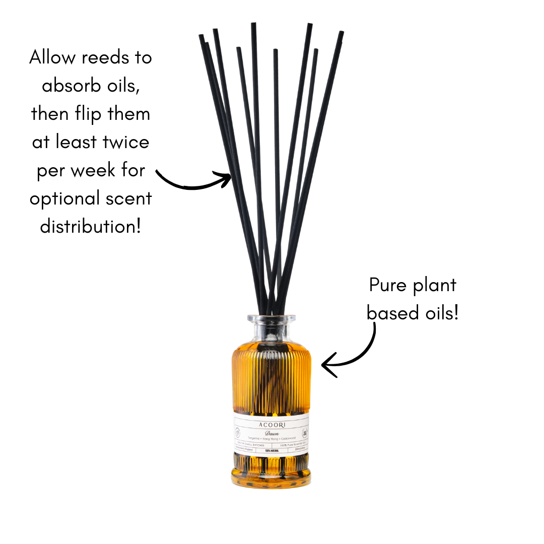 - Our reed diffusers are crafted from all-natural ingredients. For optimal scent distribution, we recommend flipping the reeds preferably twice a week. If you prefer not to flip the reeds regularly, you may not fully experience the benefits of our natural oils, so please consider this when selecting the right product for your home.